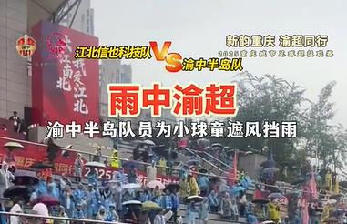 雨中渝超 渝中半岛队员为小球童遮风挡雨